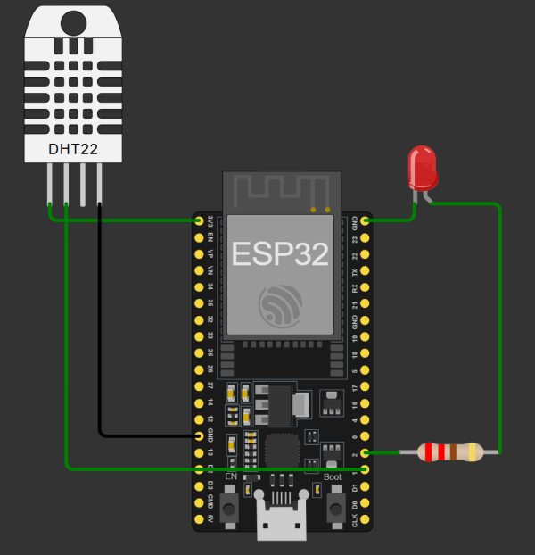 • Czujnik: DHT22 (sensor cyfrowy mierzący temperaturę i wilgotność z wysoką precyzją).