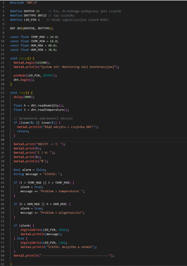 Analiza prototypu wykazała, że czujnik DHT22, mimo swojej prostoty, jest wystarczający do monitorowania ogólnego komfortu pracy w Sali konferencyjnej. W rzeczywistym wdrożeniu w budynku zarządzanym przez IoT, w kodzie powinna pojawić się sekcja Wi-Fi odpowiadałaby za przesyłanie tych danych do centralnej bazy danych, co pozwoliłoby zarządcy nieruchomości na generowanie raportów dobowych i optymalizację krzywej grzewczej budynku.